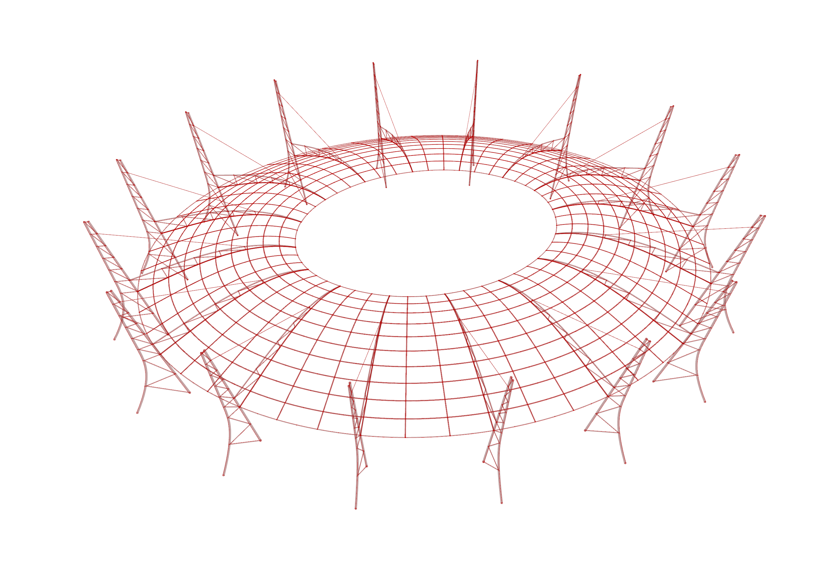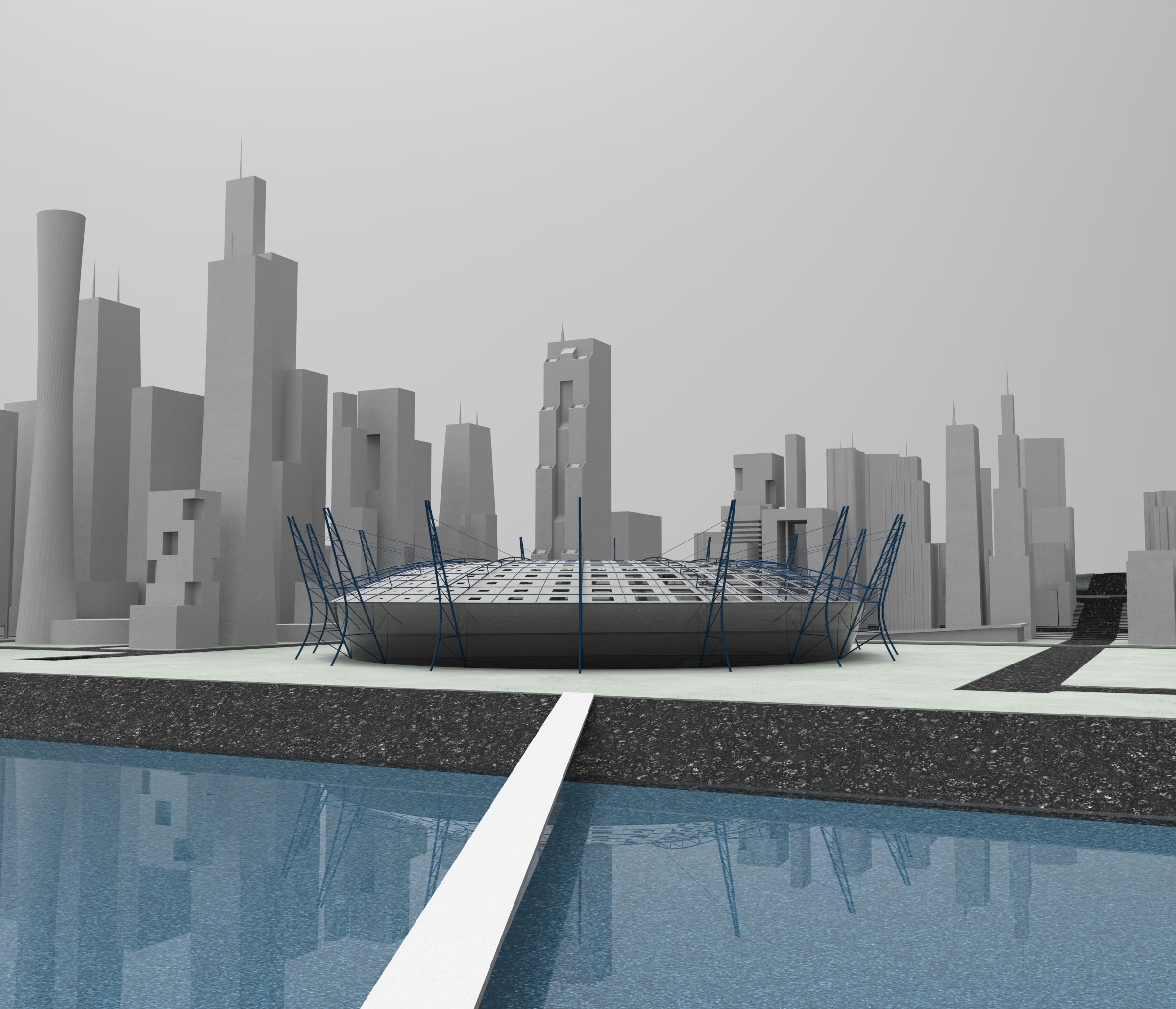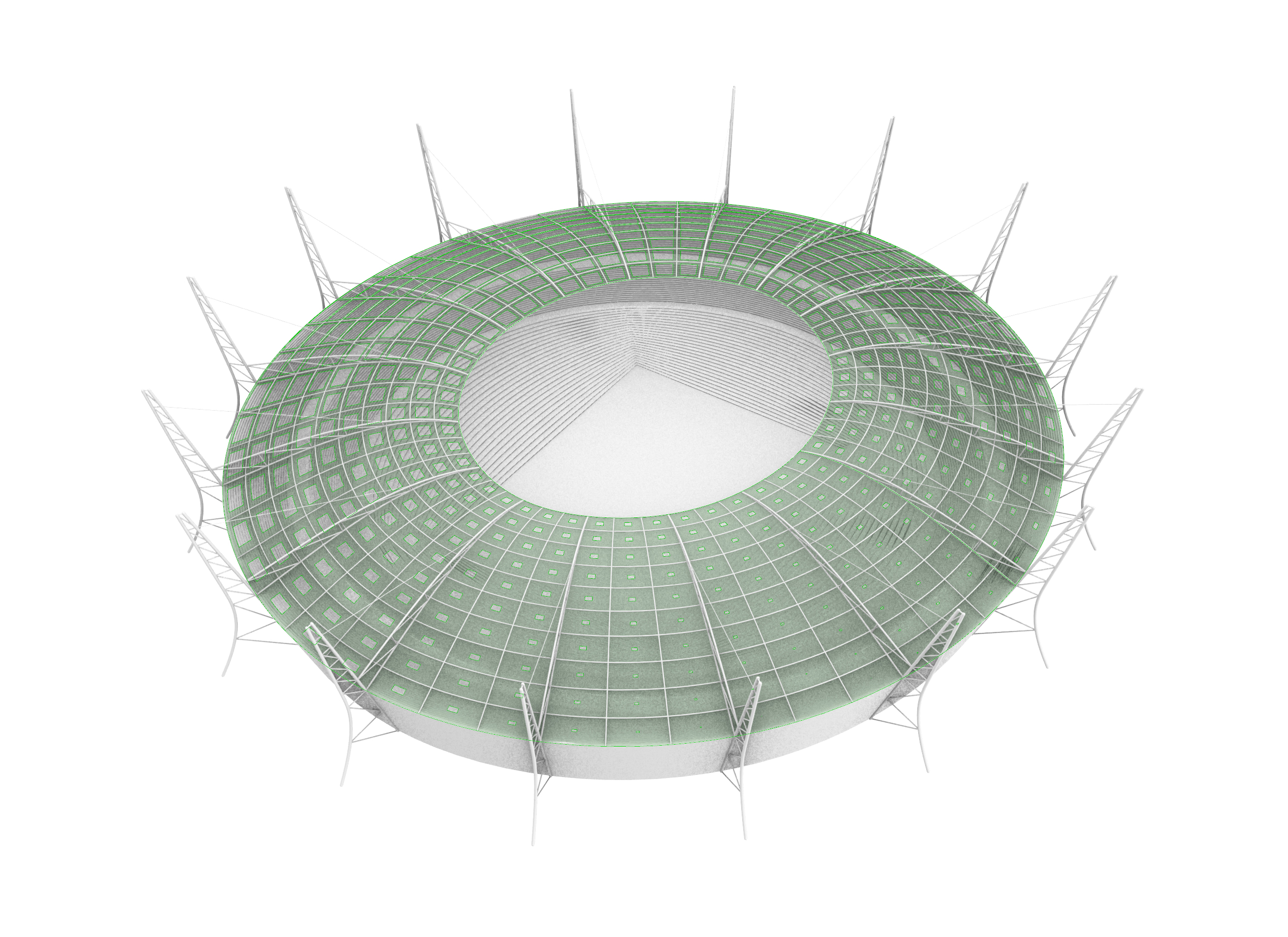The inspiration of my stadium were tensile structures to invoke a light and airy design. The design thinking was initiated by sketchy a key section of the stadium’s form; in this case it was of an abstraction of a connected steel truss column and beam The form of the column was tilted to follow the form of the stadium stands and bolstered to support the column and beam and suspension cable. The concept of the stadium roof was a radial grid of panels that could open and close based on the sun’s location. The idea is that grid spaces closer to the sun would close to provide shade and the furthest would open to provide indirect light to enter the stadium. Throughout the day, the stadium would be well shaded but optimally lit.