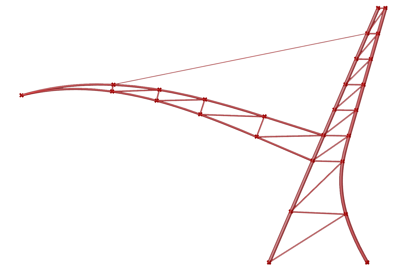 The parametric framework of the key section initiated with curves modeled in Rhino. These curves would then be parametrically subdivided, reordered, and connected to represent the truss’s cross-bracing elements. These subdivisions also informed the location of the suspension cable. The roof utilizes an attractor point script that calculates the distance between each grid point and the (sun) attractor point. These calculations are parametrized and to a domain where the closer grid points would have a closed aperture and the furthest would open.